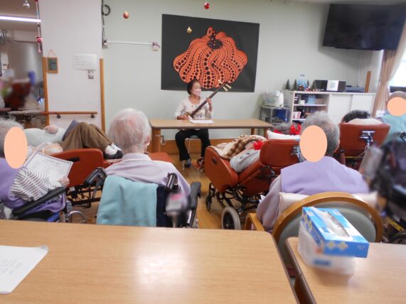 ボランティアの方に三味線の演奏をしていただきました。 「ふるさと」や「上を向いて歩こう」などお馴染みの曲の演奏で 一緒に歌ったり手拍子をしたり、楽しいひとときを過ごせました。