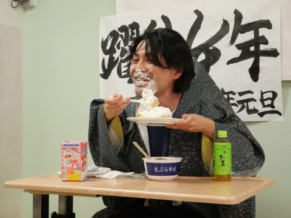 新年を祝う会の今年の出し物は職員による二人羽織。